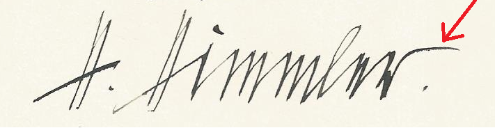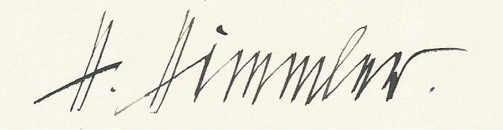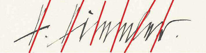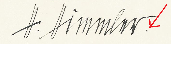 La firma de Himmler está compuesta por su inicial separada por un punto seguida de su apellido. Esta disposición indica un deseo de marcar distancia con los demás, sugiriendo una personalidad calculadora, reservada y formal en sus relaciones personales. Al mismo tiempo, el apellido es completamente legible, lo que refleja una necesidad de reconocimiento y validación social.