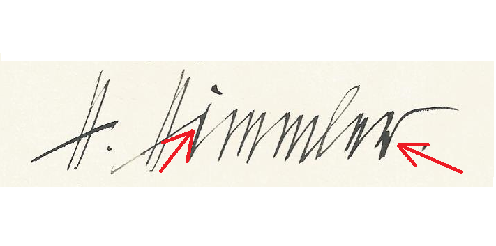 La firma de Himmler está construida exclusivamente con trazos angulosos, sin presencia de líneas curvas. Esto es un rasgo extremo y significativo, ya que los ángulos suelen representar falta de flexibilidad, dureza de carácter y una gran represión emocional. En casos más marcados, puede estar asociado a explosiones de agresividad y un carácter vengativo, rasgos que se reflejan en su papel dentro del nazismo.